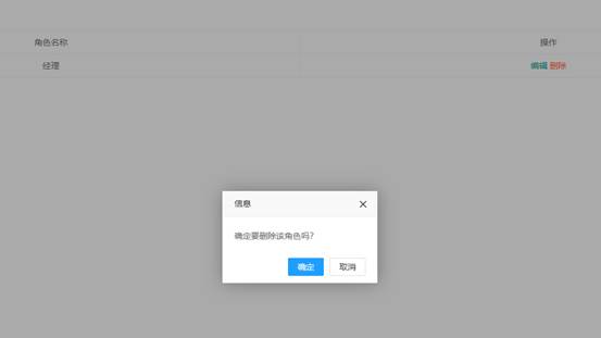点击删除按钮,弹出删除确认框,点击确定,删除角色成功。