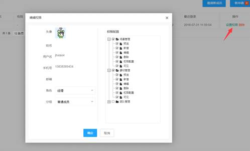 点击需要编辑权限的成员的“设置权限”按钮,弹出成员权限面板,修改对应权限。
