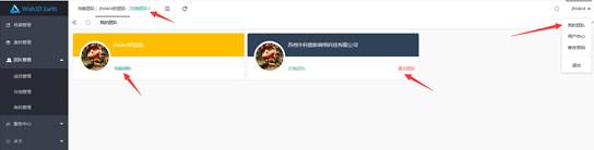 点击右上角用户名,弹出下拉菜单,选择“我的团队”按钮,或点击屏幕上方当前团队后面的“切换团队”按钮进入我的团队界面。您可以在这里切换团队,退出其他人的团队。