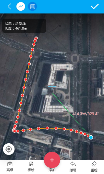 开启路径规划绘制后,进行线面绘制时,会根据点位信息进行自动规划(蓝色线为规划线):