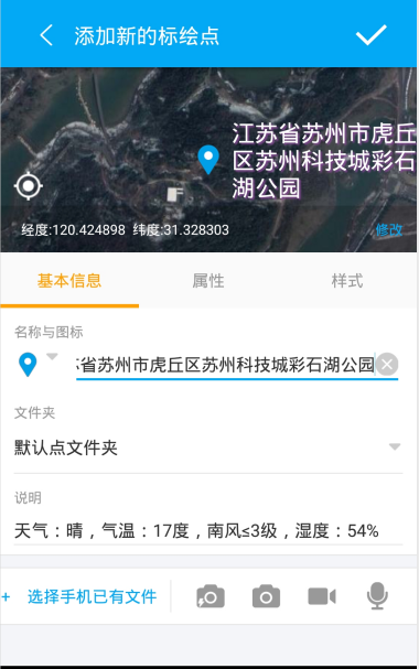 基本信息包括该点的名称、存储文件夹、坐标、说明(描述信息),点位图标,附件选项;