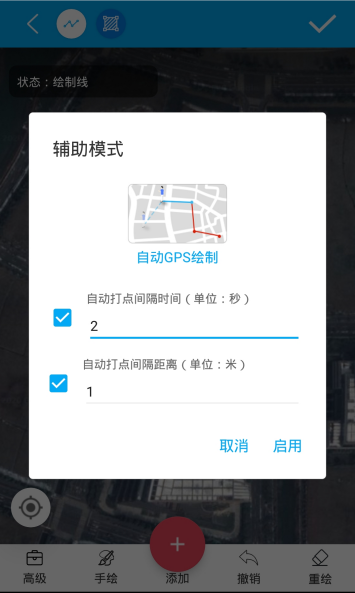 自动GPS绘制:开启后,会根据设置好的打点间隔时间与距离进行自动绘制