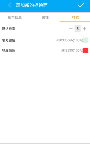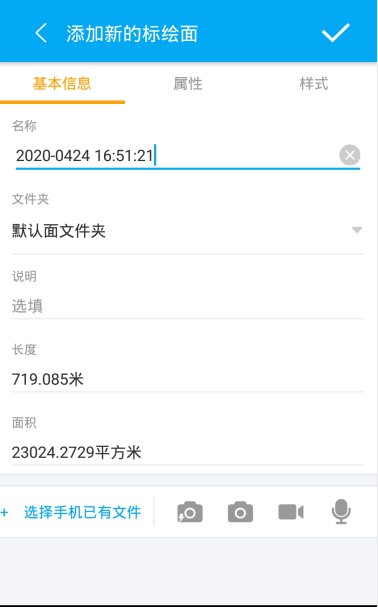 基本信息页面包含:名称、存储文件夹(可参考7.1打点内选择文件夹)、说明、长度(周长,不可更改)、面积(不可更改)、附件选项(可参考7.1打点内附件选项)
