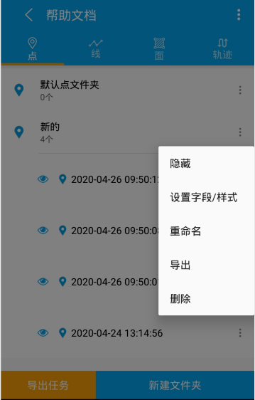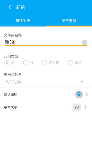 基本信息:文件夹名称、文件夹类型(点,线,多边形,轨迹)、坐标系(不可更改)、默认图标、文件夹复制、字体大小。
