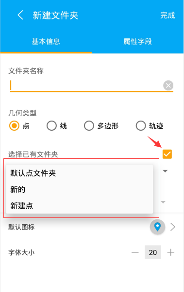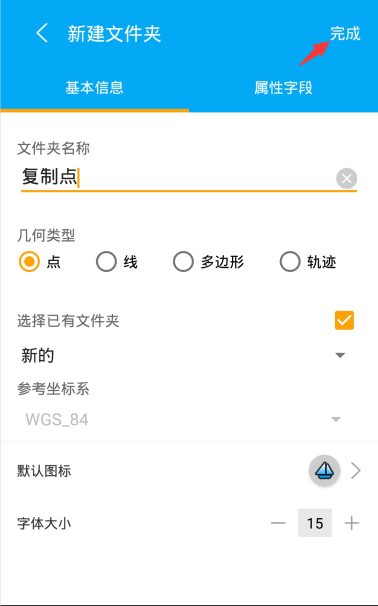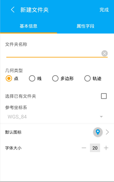 基本信息:文件夹名称、文件夹类型(点,线,多边形,轨迹)、坐标系(不可更改)、默认图标、文件夹复制、字体大小。