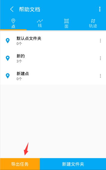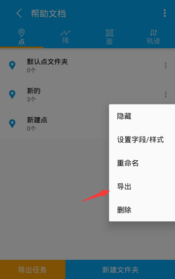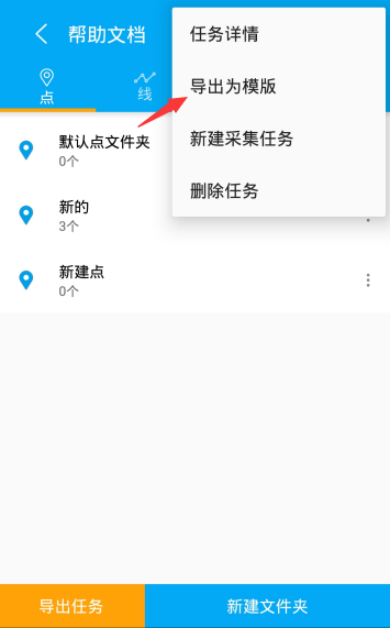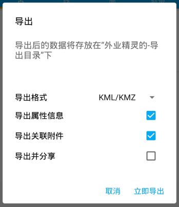 任务导出:可通过文件夹操作选项 或 数据管理页面中 下方导出按钮进行导出,点击后会弹出导出弹框,可针对需求进行KML/KMZ 、SHP 、Excel 进行导出