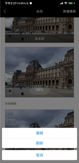 水印模板选择页面包含:水印模板选择、新增模板、模板编辑等功能