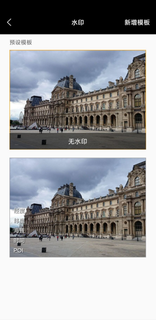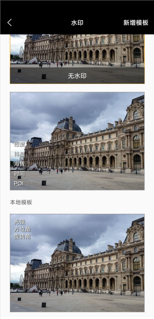 水印模板选择页面:点击右下方水印图标即可跳转至水印模板选择页面。