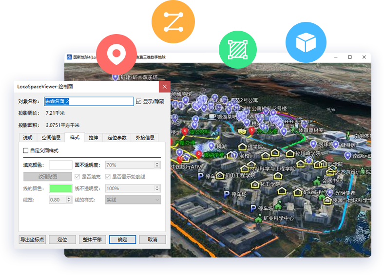 點、線、面、體快速繪制;豐富矢量編輯工具;直接輸出KML、SHP、CAD等;