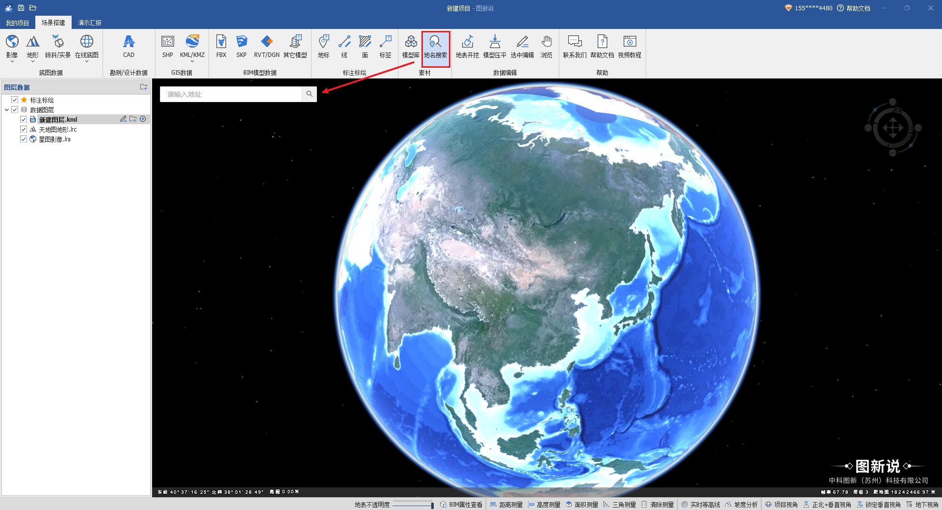 图新说“地名搜索”功能可以在输入框内搜索省、市、区、地名,获取行政区划边界和地点信息,可将搜索结果保存在“标注标绘”内。