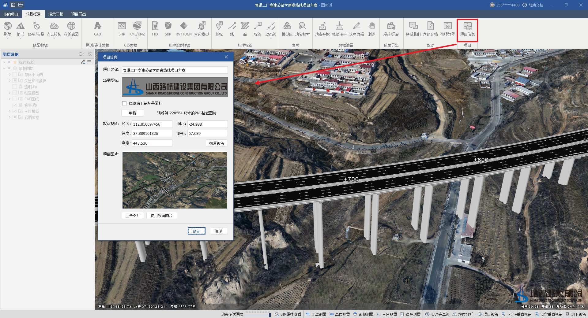 项目信息主要是用于设置当前整个项目工程文件的名称、场景图标(右下角logo)、初始视角、项目图片。