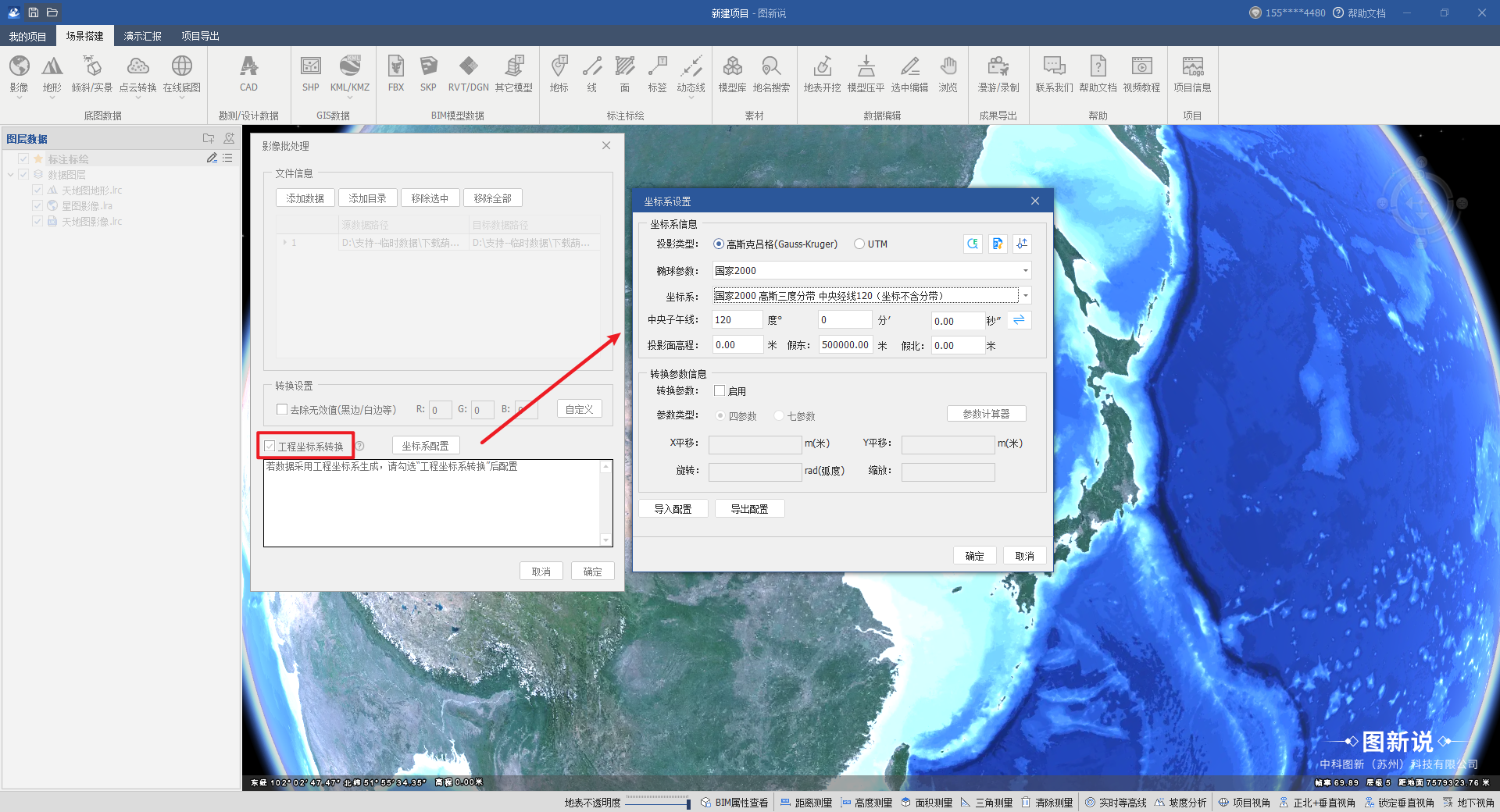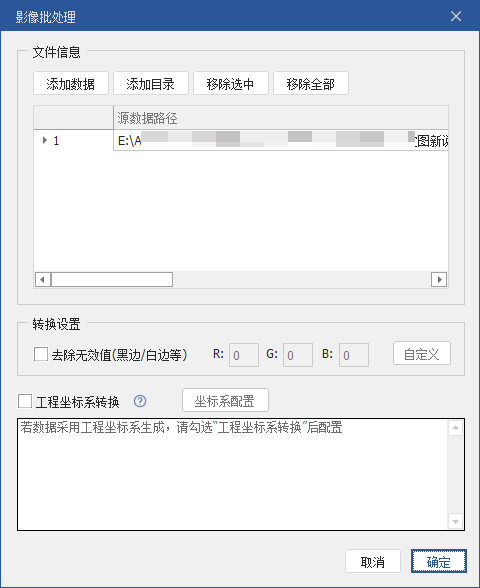 (6)工程坐标系转换:默认不勾选,勾选后,进行坐标系配置,配置完成后对列表中所有数据生效。(一般影像生成时会配置投影,如果制作时未选择投影信息,无投影的影像可通过配置工程坐标系加载到图新说)