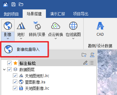 图新说支持tif、mbtiles、img、lrp格式的影像数据直接导入,点击“影像”功能,直接选择文件即可导入。