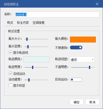 显示标签:默认不勾选;勾选后,在整条轨迹线中心点显示一个该动态线名称的标签;