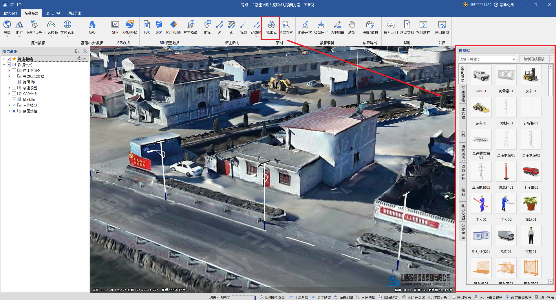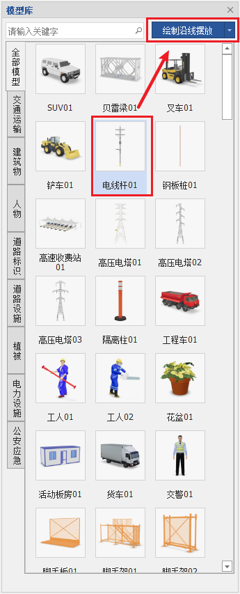 图新说模型库内有多种类型模型,支持搭建场布、临时场景等。在现有模型库模型基础上,图新说支持模型库内的模型沿线摆放,例如,按照施工范围摆放围栏、按照公路路线以一定间距摆放路灯等。