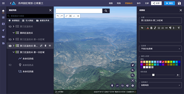 在搭建好的場景中添加各類二三維數據,并可標注附屬信息,助您表達豐富的場景故事